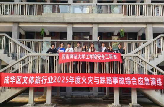 为深入学习贯彻习近平总书记关于安全生产的重要论述,拧紧文旅行业 “安全阀”,提升突发事件应急处置协同能力,2025年11月28日15时,我院安全工程系联合成都市成华区文化体育和旅游局,在熊猫假日酒店成功举办火灾与踩踏事故综合应急演练。我院安全工程系王雨副教授带领周万乐、江瑞、李鑫燚等9名学生全程参与,以专业素养为演练注入硬核支撑。