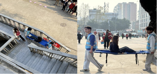 随后开展的踩踏事故演练中,模拟二楼楼梯拐角因顾客滑倒引发拥挤险情,疏散队员第一时间上报并疏导人流,指挥长迅速调度救护组携带担架、急救箱赶赴现场,成功转移“受伤人员”并实施初步处置。我院师生深度参与火情研判、处置实操、人员疏散等关键环节,以专业知识优化处置流程,显著提升了演练的规范性与实战性。